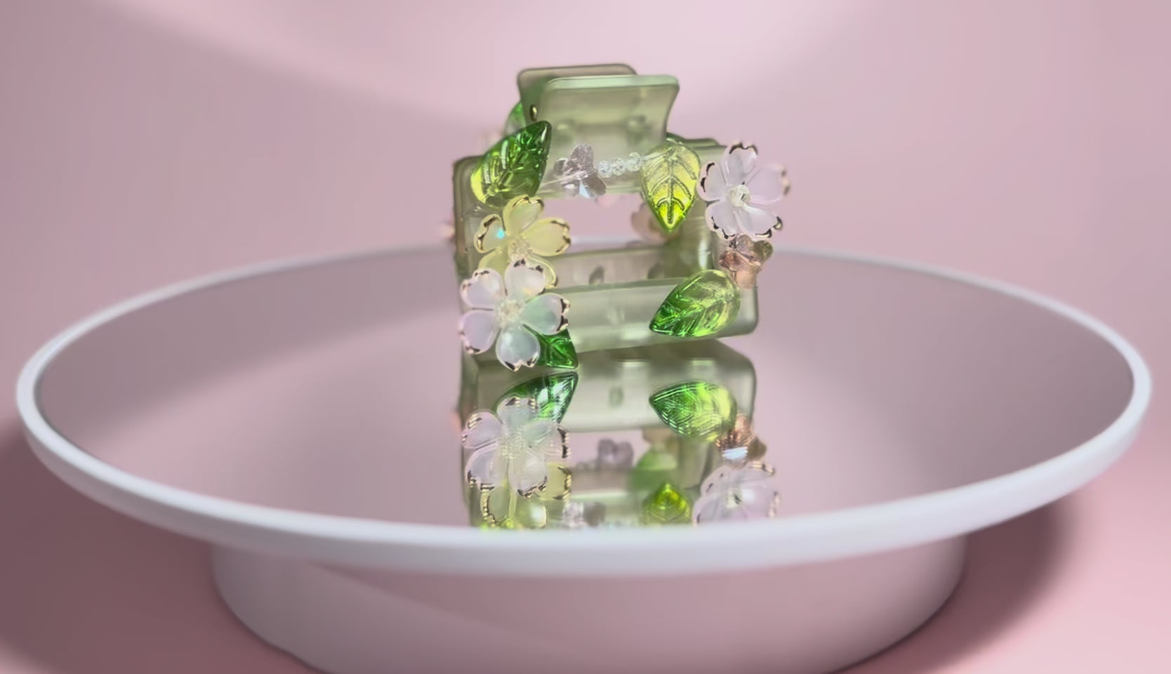 Taking you into your favorite fairytale, our Enchanted Garden Fairy clip brings the magic to any outfit. Decorated with pastel florals, butterflies float through the leaves adding a mystical touch to the clip. Set on a mini claw clip in a sage green translucent clip, transform your look into something out of your wildest dreams!