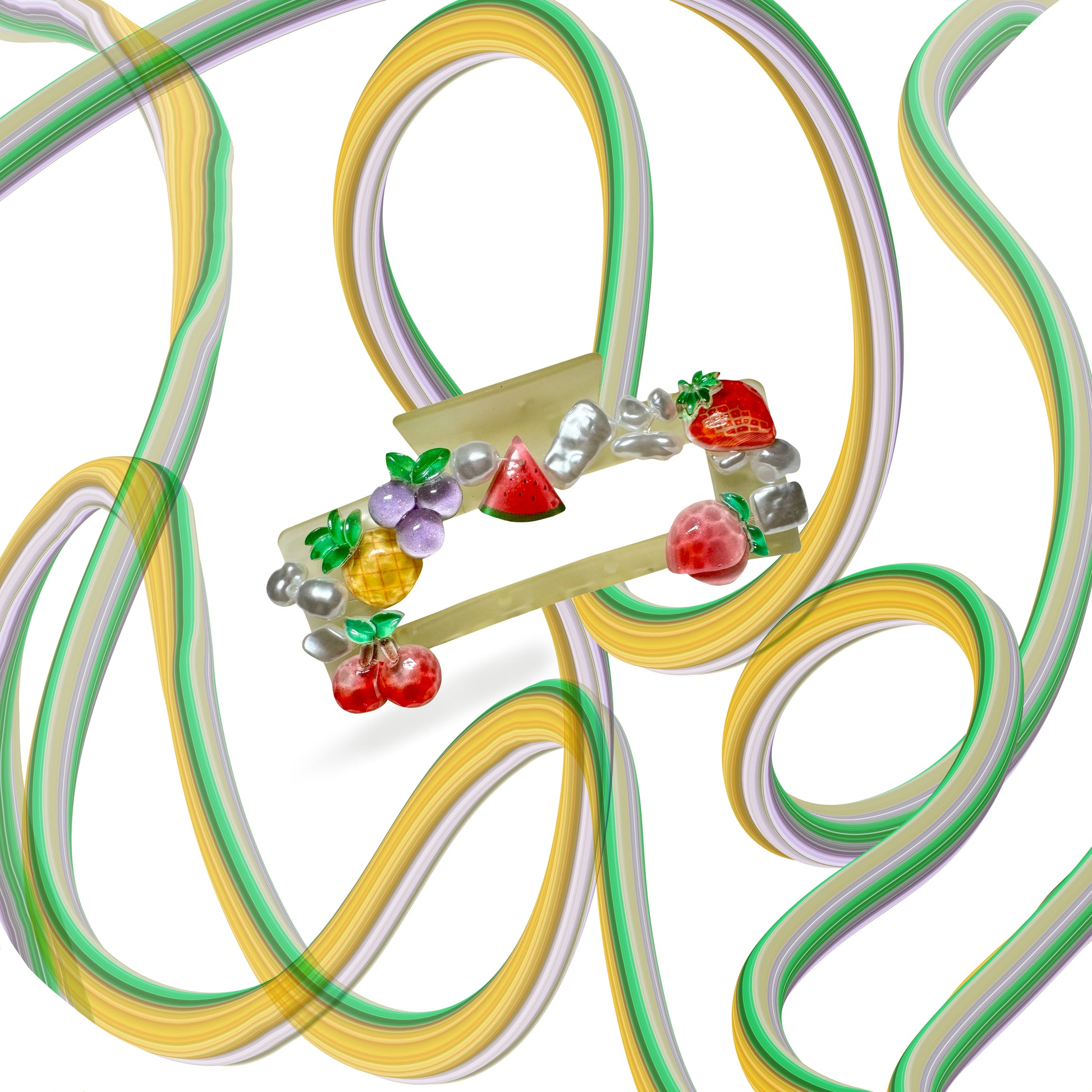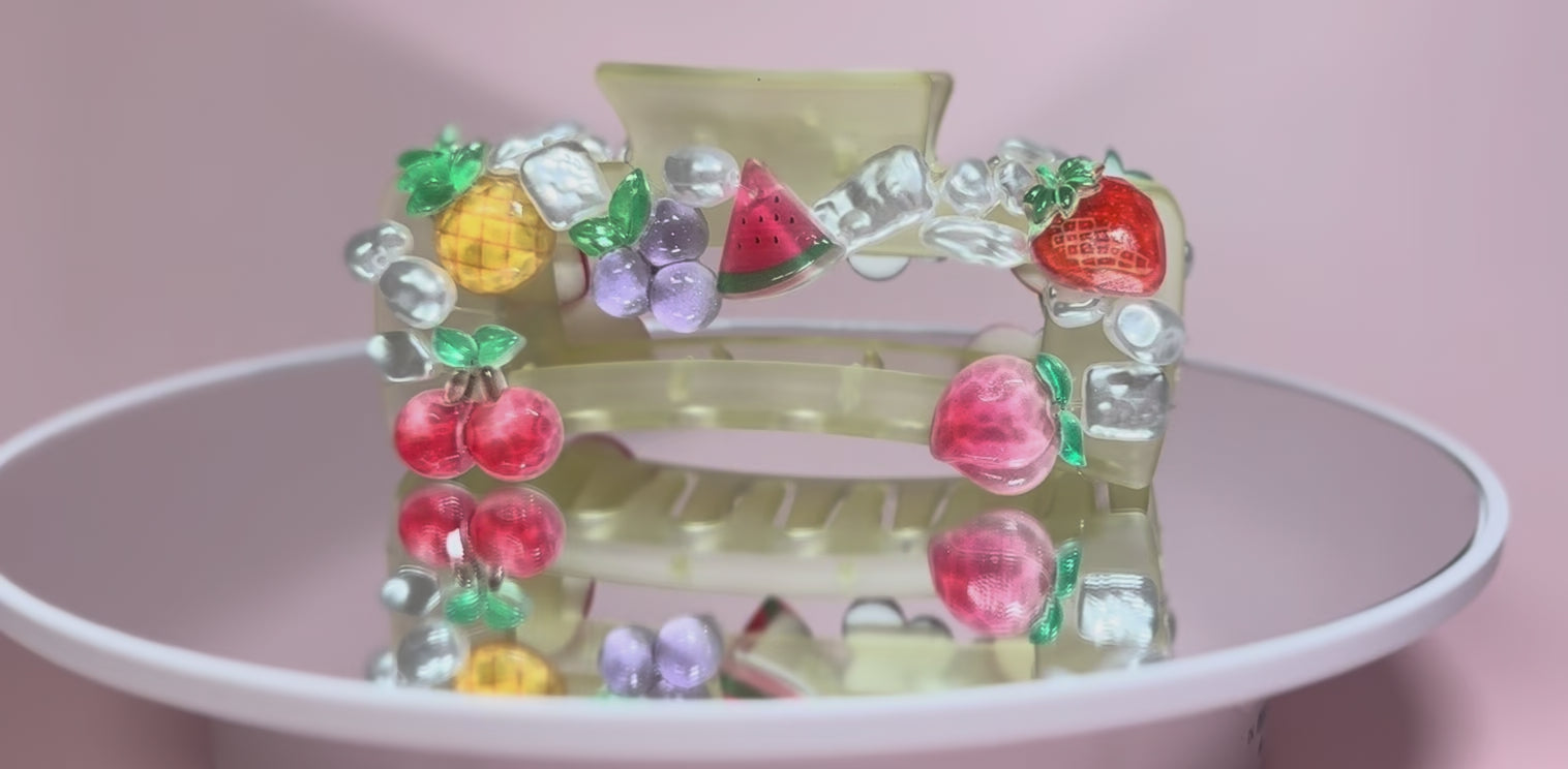 Fruit salad, yummy yummy! Our colorful clip features all the refreshing fruits you love, adding a whimsical and unique twist on everyone’s favorite summer snack. Adorned with pearls, the colors of the fruit pop against the pastel yellow base of the large claw clip, and is guaranteed to make any outfit more fun! Whether you’re running errands or on the beach, this clip will brighten up your day and put a smile on everyone’s face!