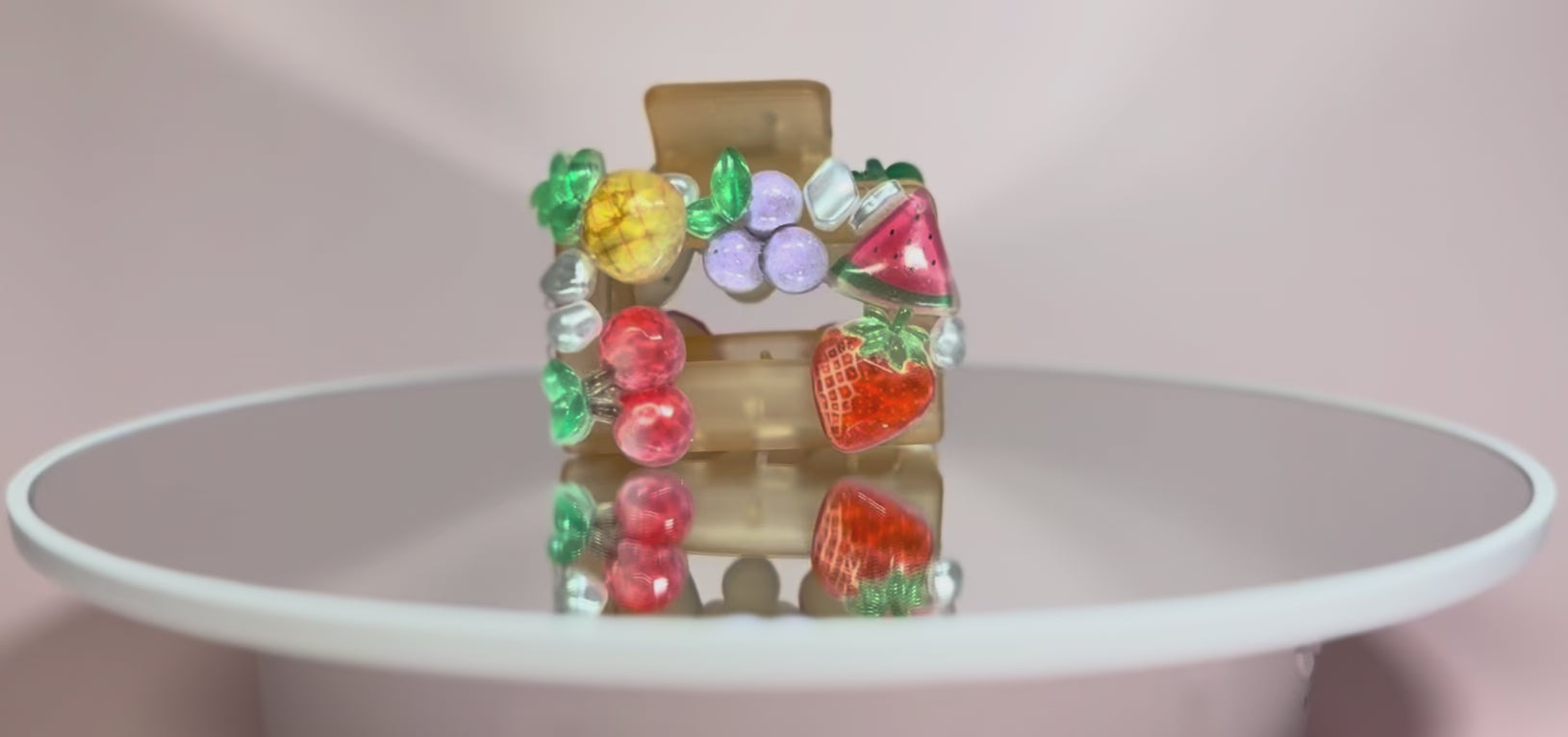 Summer just got a whole lot cuter with our mini version of Fruity Cutie, now set on a tangerine base! This mini is perfect for adding a bit of vibrancy to an outfit, and when you’re not wearing it, can be clipped around your purse strap as an added touch of fun! Great for on-the-go hairstyles and short/fine hair, you get the iconic original aesthetic with more compatibility and the same hold strength of the original large size, making it an essential accessory to your everyday vibe!