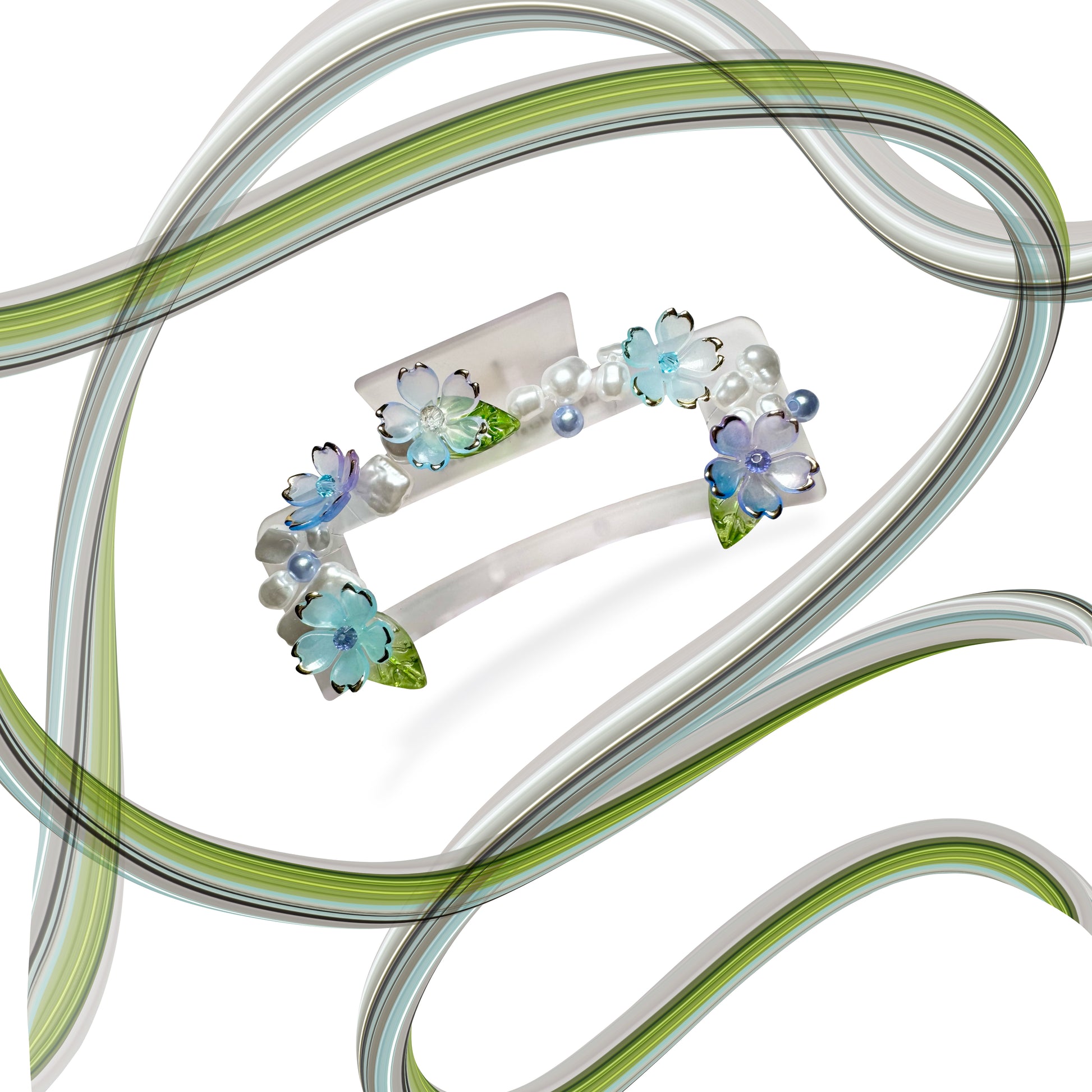 Step into a dreamy oasis with our Lavender Lagoon clip, featuring stunning hues of purple and blue. With beautiful crystals laid into the floral arrangements and offset by pops of blue pearls, this clip dazzles any time of the day!