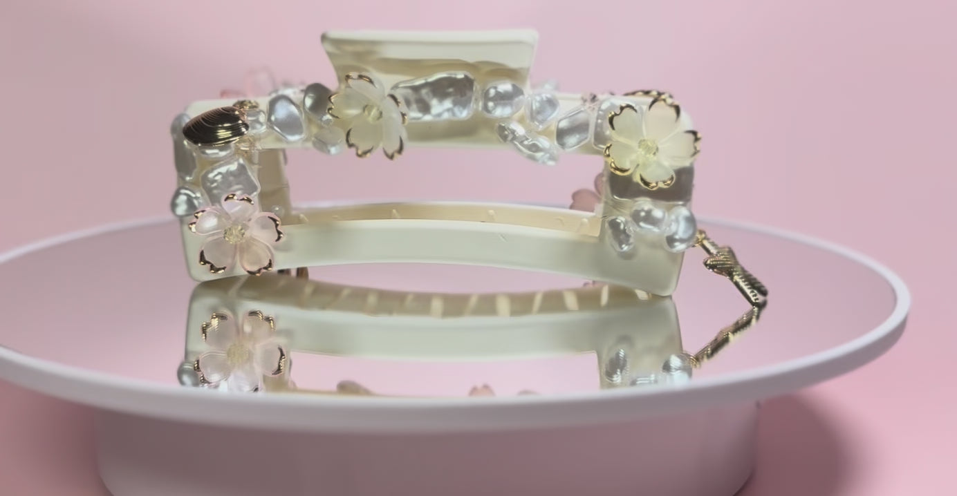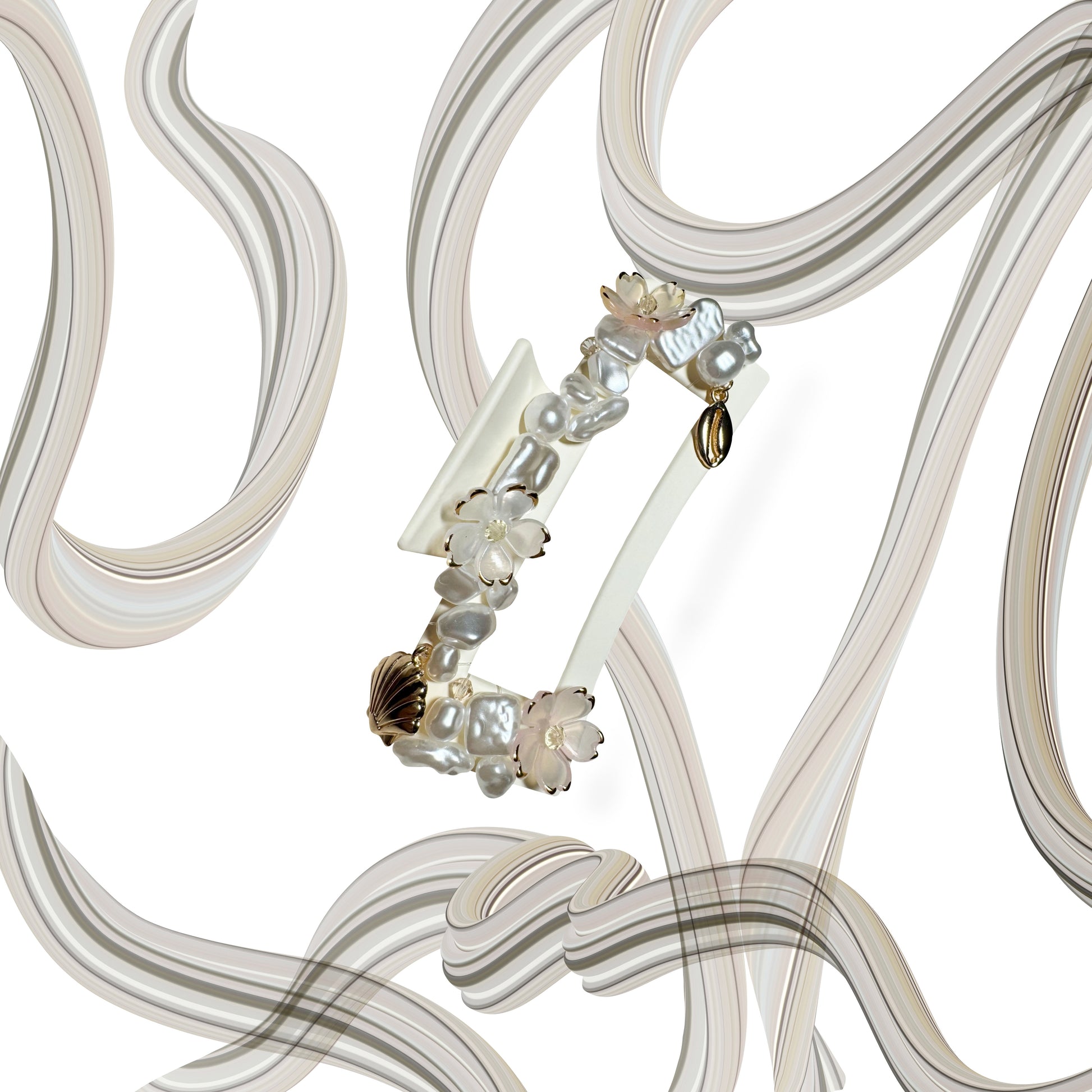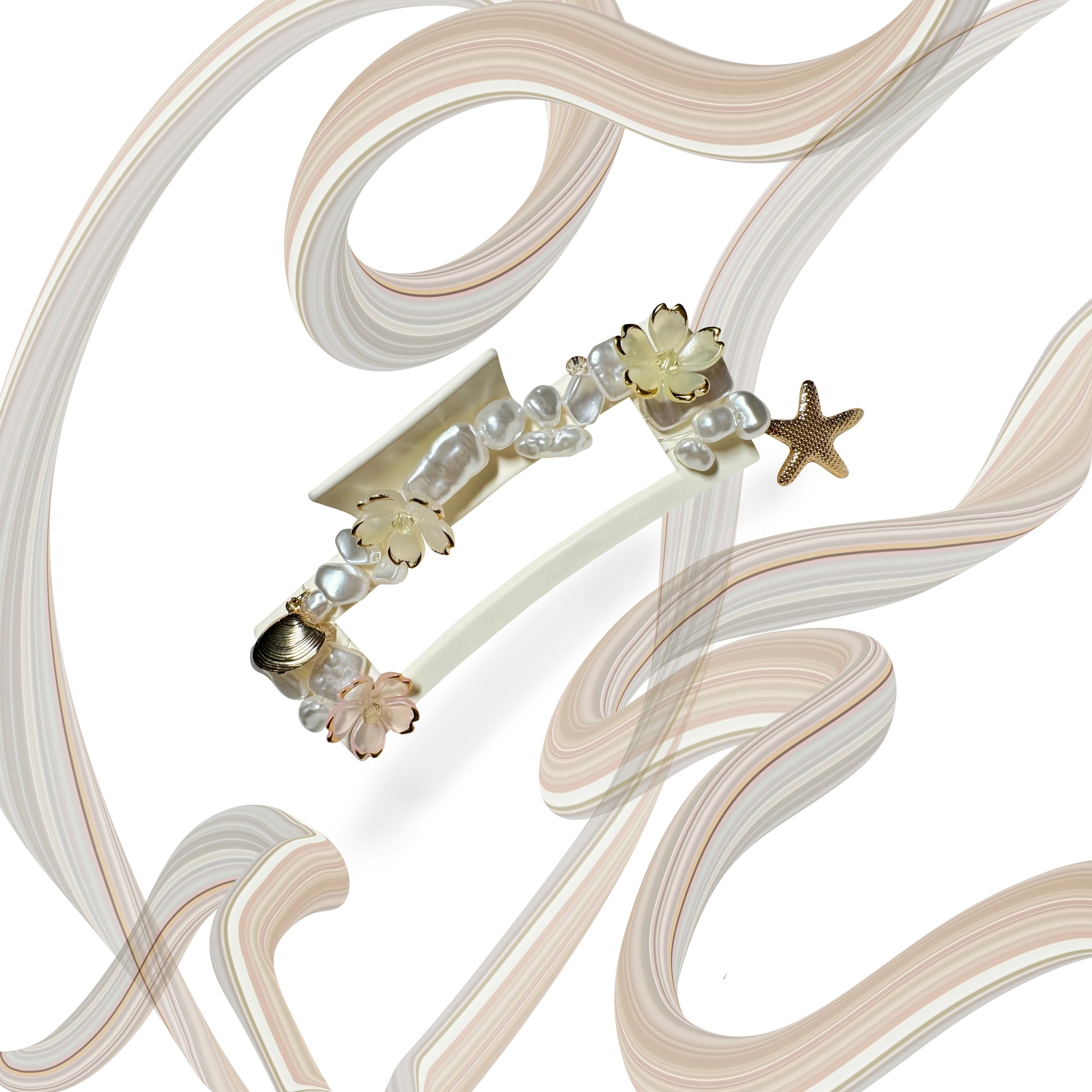 Elegant, unique, and stunningly functional. Our one of a kind Seashell Shores large claw clip adds the perfect classy touch to a beachfront getaway or wedding. Made with assorted freeform shaped beads span across the ivory clip with golden charms hanging, perfectly positioned to dangle down when worn in your hair. Inspired by the movement of the tide, these charms trickle off in an effortless way.