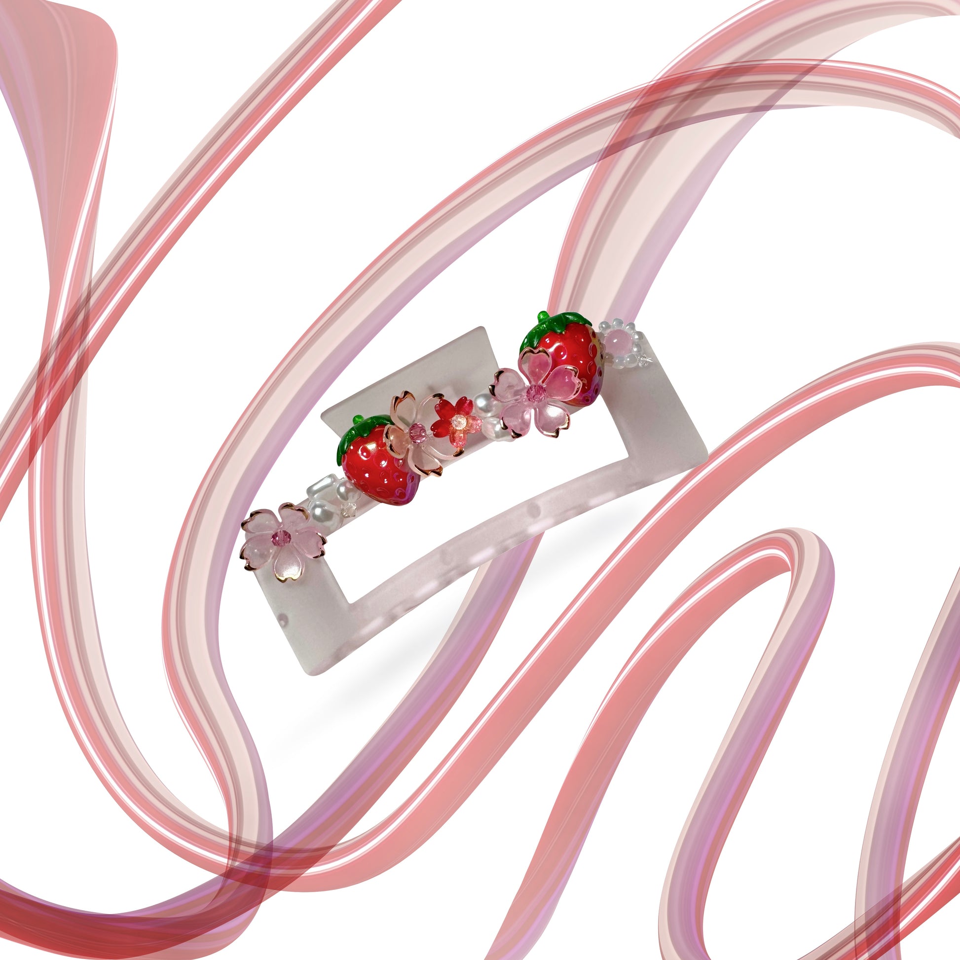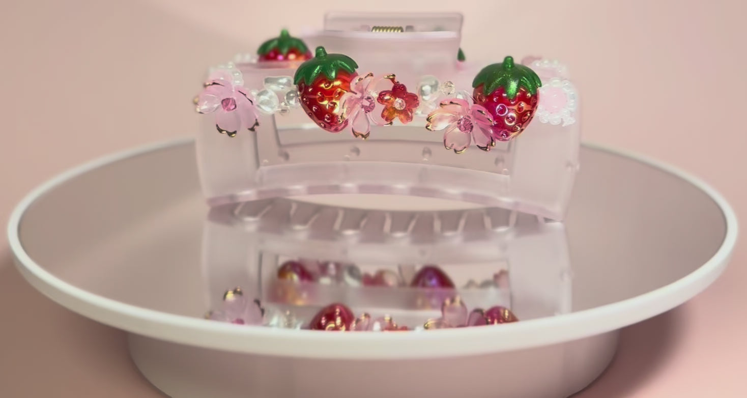 Nothing but sweetness, Strawberry Shortcake brings a whimsical touch to any outfit. Designed on a large, baby pink frosted claw clip, Strawberry Shortcake features iridescent and juicy strawberry beads with pops of cherry blossom flowers, all accented by pearl and crystal beads that reflect the light and make the strawberries sparkle. In addition to its uniqueness, this clip can be worn casually at the office or paired with themed outfits and bright colors, making it the perfect pop to everyday life. Intended to bring confidence and make you feel good on a messy hair day, Strawberry Shortcake is a must have staple in everyone's hair!